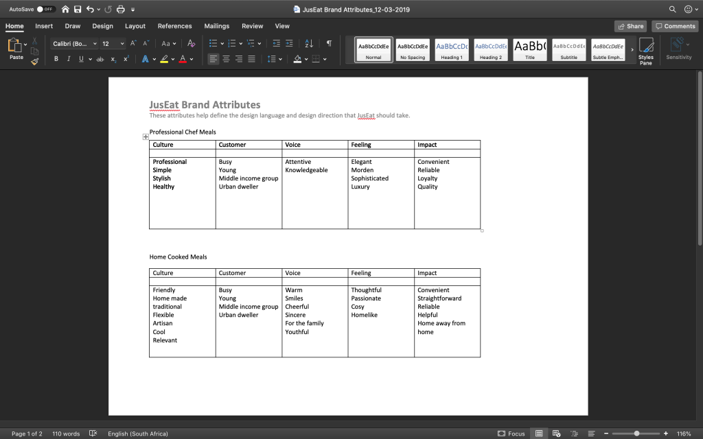 We used the brand attributes to define the culture of the company, the type of customer that they wish to attract, the voice or tone of the brand, the feelings that they would like the brand to invoke and the impact that they want to make.